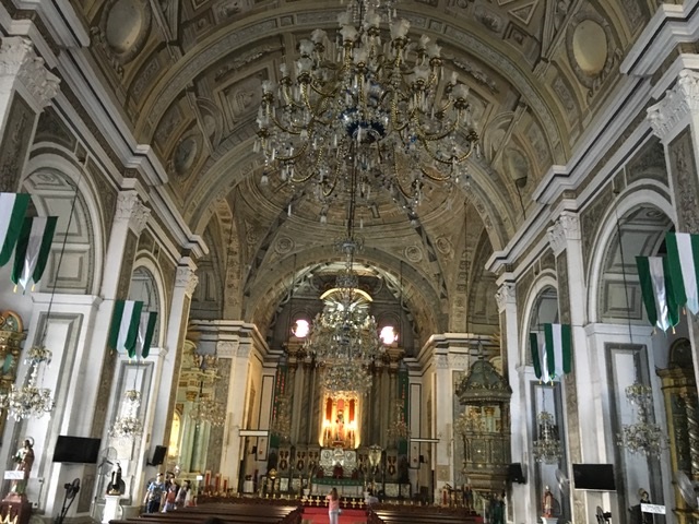 Friday I strolled on the other side of Rizal Park, taking me past the outdoor amphitheatre and Chinese Garden. I was impressed to find an area dedicated to senior citizens…who also have a special line at airports giving them the same treatment as VIPs…which of course, is only right and proper. Finally, I reached the walls of the old city, which is remarkably well-preserved – or more likely well-restored given that Manila was the most bombed city in World War II, second only to Warsaw. The cathedral interior is almost entirely new, but the church of San Agustin seems to have survived much better…its most serious damage appears to have been the loss of one of its towers in the strong earthquakes of 1880.