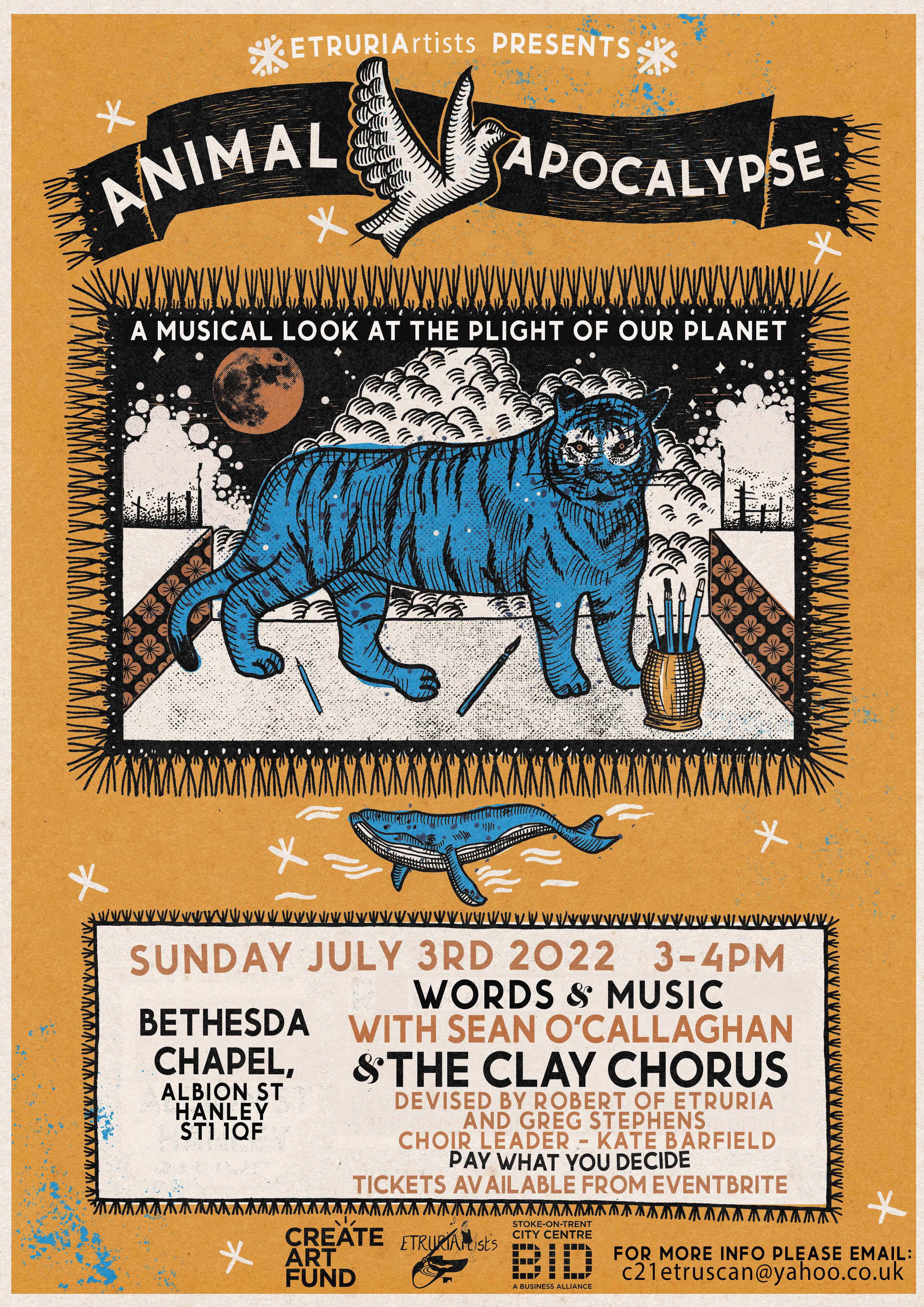 Animal Apocalypse – a musical look a the plight of our planet – was devised by Robert of Etruria and Greg Stephens with actor Sean O’Callaghan as narrator and the Clay Chorus conducted by Kate Barfield. I sang with the choir and played the organ as accompanist, soloist and in duets with cornet player Mike Walker. The event took place in the historic Bethesda Chapel. Ray Johnson filmed the performance…so there’s something to look forward to.