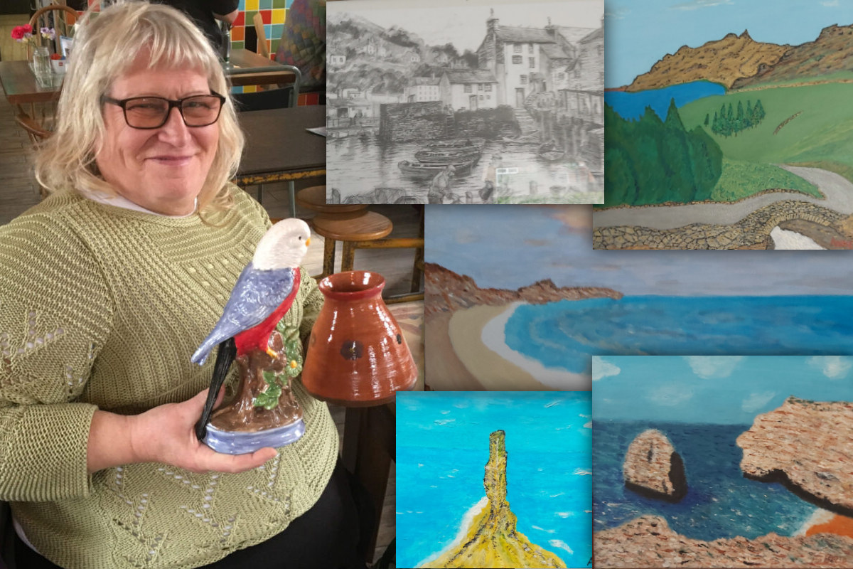 Composite image by Andrew Colclough of Angie with some of her artwork that was displayed at the retrospective exhibition at B-Arts
