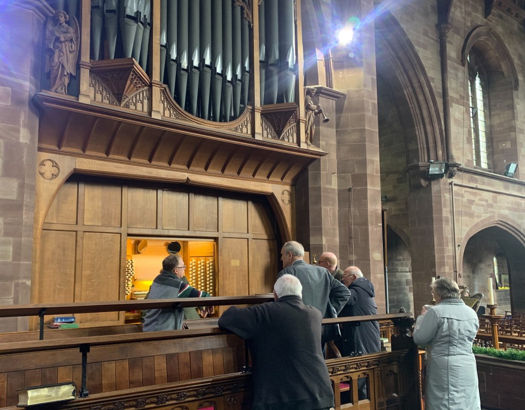 It was my responsibility to organise the North Staffs & District Organ Society (NSDOS) visit in May to local organs of interest. The day began with a visit to explore the fine three manual instrument at St Wulstan’s, Wolstanton, expertly rebuilt by Philip Cartwright. A refreshing lunch at the Borough Arms in Newcastle, was followed by a visit to St Mark’s Basford before our final stop the big four manual organ at St Paul’s Newcastle.