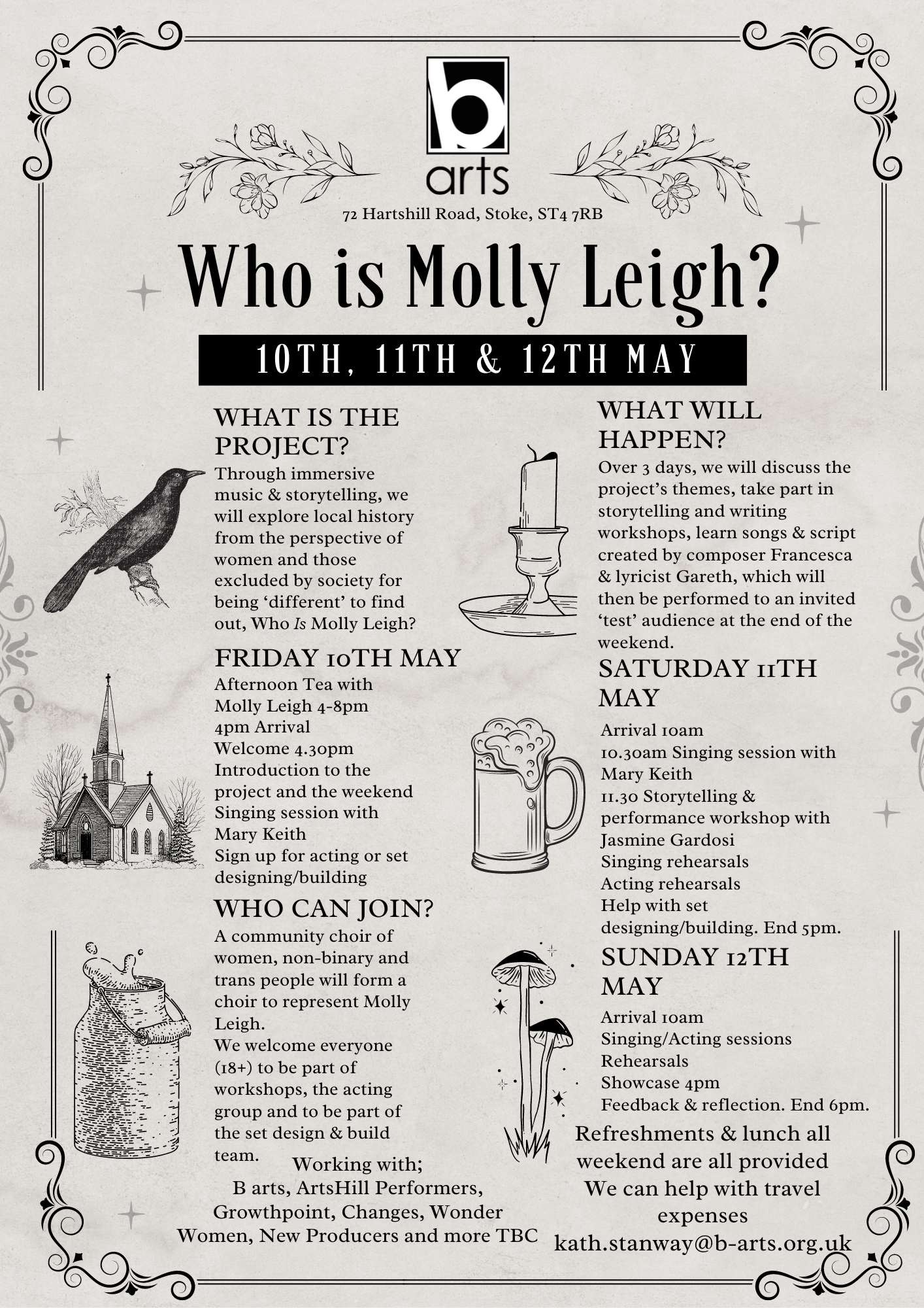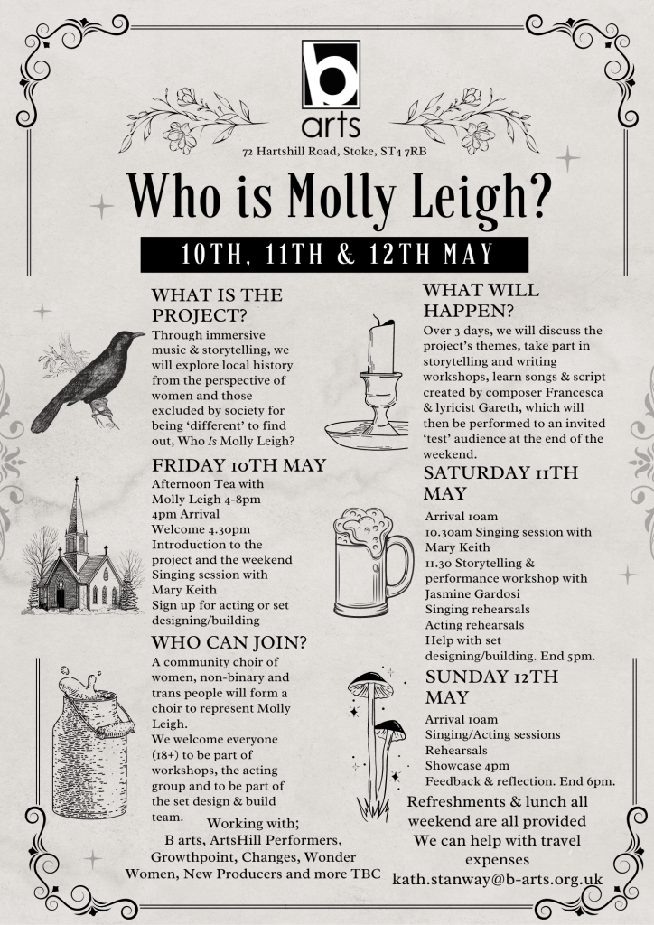 The ’Who is Molly Leigh?’ project with B-Arts offered a chance to employ the theatrical side of my character. Over the course of one weekend in the middle of May, an enthusiastic bunch of professional and amateur artists explored the myths and facts around Molly (Margaret) Leigh…the so-called witch of Burslem. We discovered there was far more fiction than fact in many of the tales…often the most unlikely stories were the ones best remembered. It was a most enjoyable weekend…I was in my element as the publican of the inn where all the gossip about Molly Leigh was spread. Composer Francesca and librettist Gareth have gone away to work on the material we produced to compose an ‘opera’. The piece will be performed next year, not at Glyndebourne or Covent Garden…but here at B-Arts in Stoke on Trent.