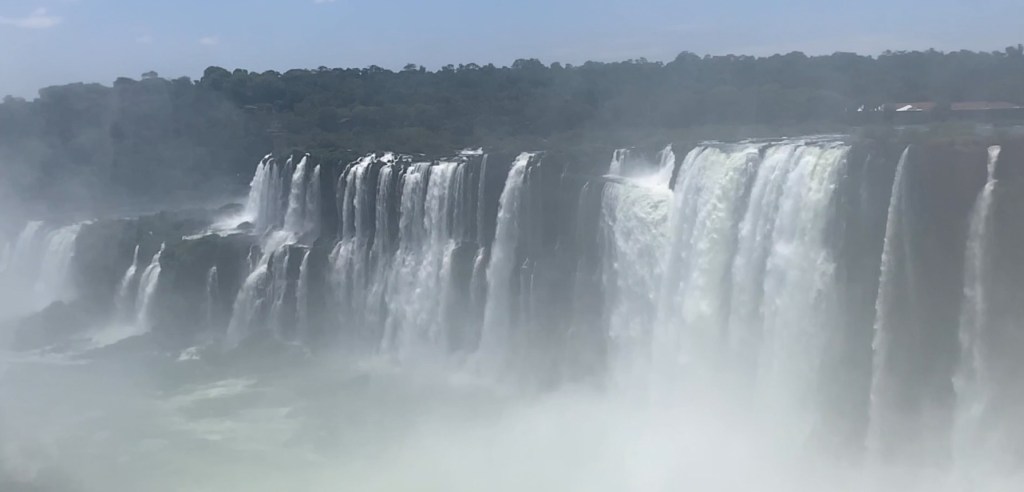 The falls are miles away from the station, thankfully, there is a train that takes you to the trail leading to the Devil’s Throat Falls. Even so, it is quite a long trek on the elevated pathway to the platform on the edge of the Devil’s Throat, where the water plunges down with frightening force. The platform was small for the high volume of sightseers…I failed to get single still shot…but the video, astonishingly. is quite good. The surrounding jungle teems with wildlife, from colourful butterflies…I spotted yellow ones as big as bats… to curious coatis who seemed to have latched on to the easy free food from tourists…whole families of the cute little creatures wandered around the station.